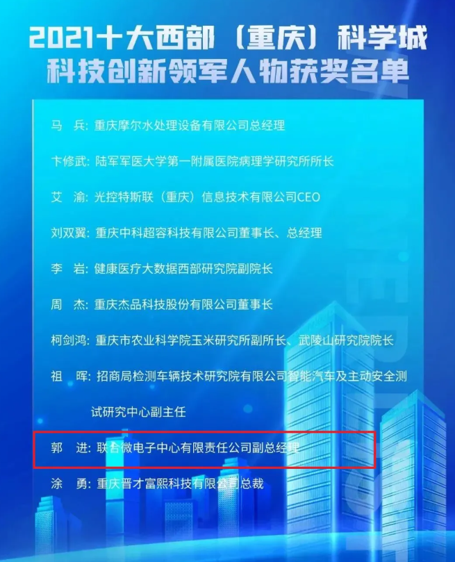 近日,“科技创新·人才领航”2021十大重庆科技创新年度人物评选发布典礼在西部(重庆)科学城举行。园区企业联合微电子副总经理郭进荣誉上榜2021十大西部(重庆)科学城科技创新领军人物。