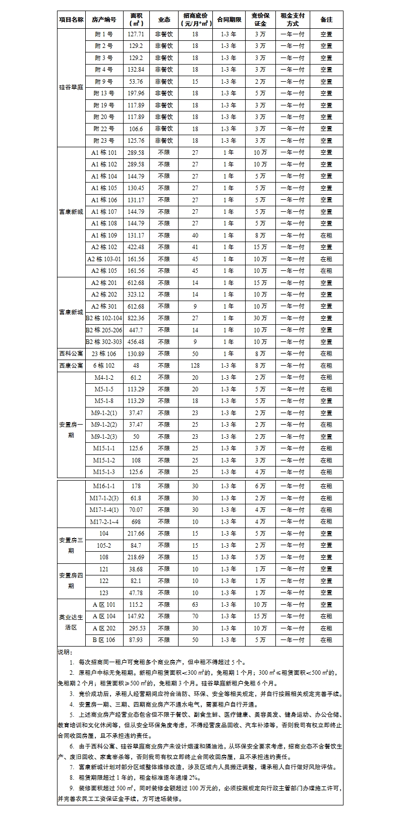 本次招商在公开公平公正的原则下采用竞价方式确定商业房产承租权。详情如下: