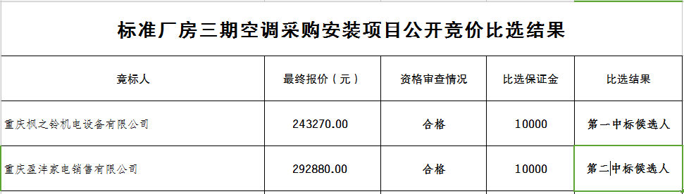 标准厂房三期空调采购安装项目公开竞价比选结果
